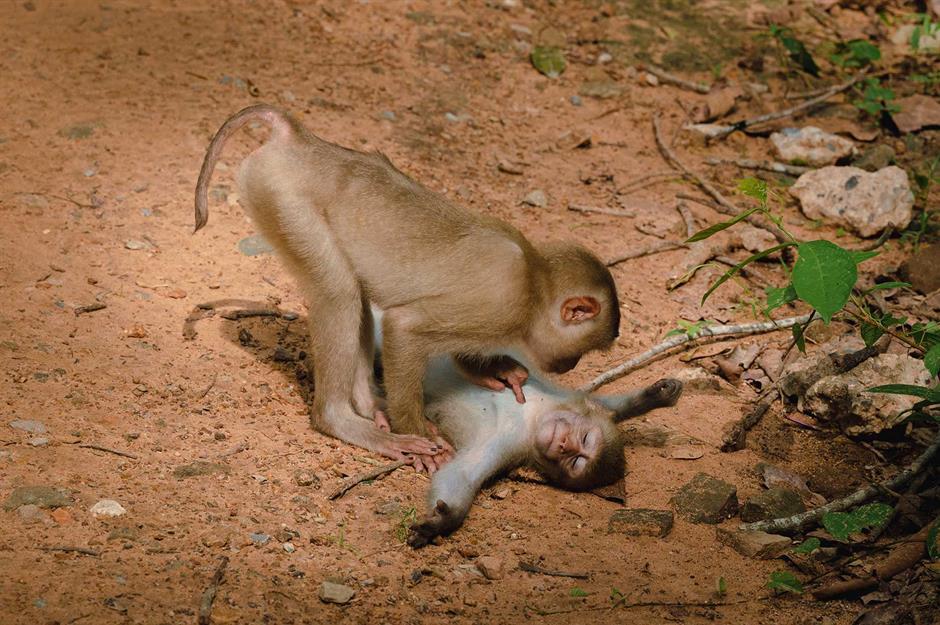 Dieses Äffchen versucht seinen Kollegen zu wecken, der seine Mittagspause für ein kleines Nickerchen im Sand nutzt. Das nächste Meeting verpasst er wohl ...