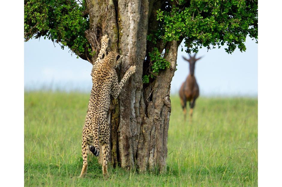 Wir sind uns nicht sicher, ob die Antilope im Hintergrund tatsächlich viel Spaß daran hat, mit diesem Geparden Verstecken zu spielen …