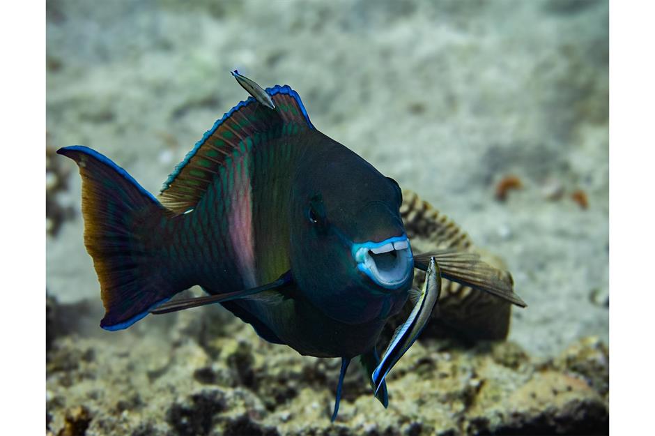 Dieser grinsende Papageienfisch genießt es sichtlich, von seinen kleinen Fischfreunden geputzt zu werden.