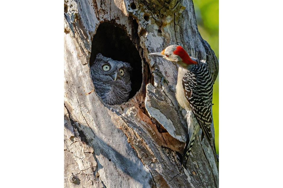Dieser Blick sagt alles: Der neugierige Rotbauchspecht hat eindeutig das falsche Nest erwischt.