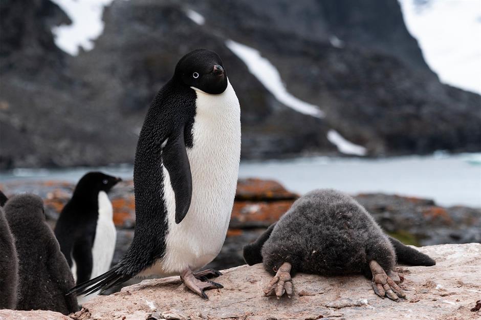 Schulterzuckend steht dieser Pinguin-Vater neben seinem Teenager. Der hat mal wieder die Nacht zum Tag gemacht und will morgens einfach nicht aus den Federn.