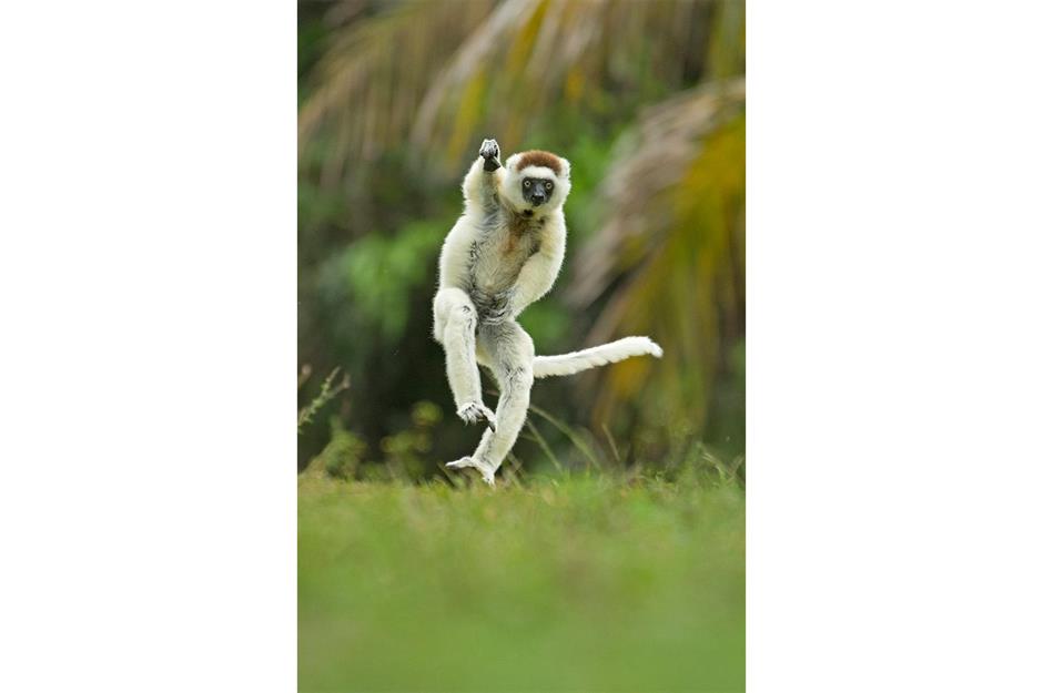 Dieser pelzige Superheld zeigt, dass man zum Fliegen keine Flügel braucht. Der Sifaka-Affe ist fest entschlossen, die Welt zu retten.