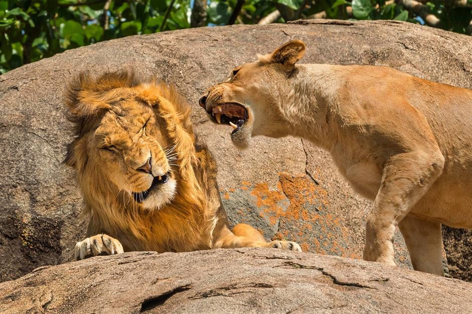 Streit kommt in den besten Familien vor. Was auch immer dieser Löwe getan oder nicht getan hat, seine Frau hat es ordentlich wütend gemacht.