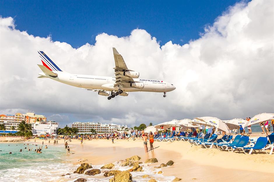 Cette approche si près du sol est aussi impressionnante pour les passagers que pour les spectateurs. La piste de l’aéroport international Princesse-Juliana de Saint-Martin se trouve juste au bord de la mer, et les pilotes doivent surveiller de près leur altitude – ainsi que les baigneurs – lorsque l’avion rase la plage de Maho.