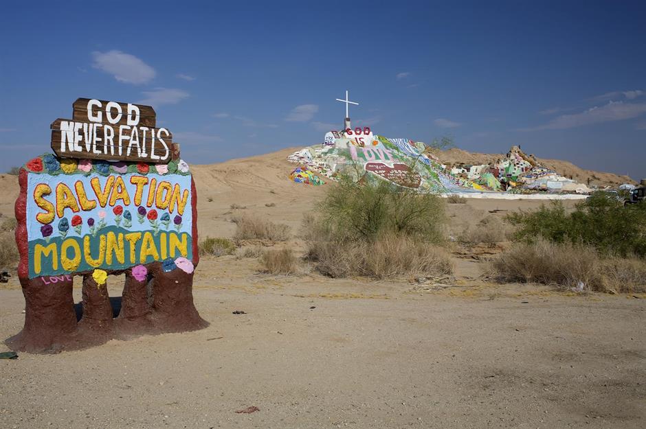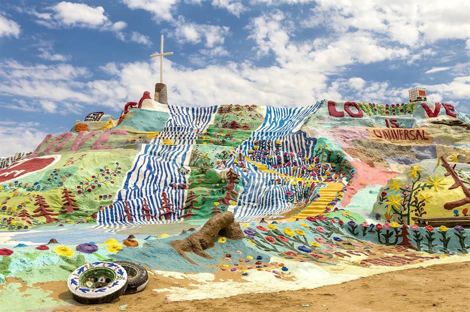 Il a fallu 28 ans et deux millions de litres de peinture au latex pour achever cette montagne artificielle. Aujourd'hui, elle est devenue une attraction populaire sur la route du désert californien.