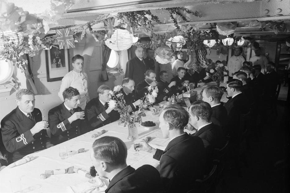 Official dinners held on British Royal Navy vessels include a Loyal Toast to the reigning monarch – which is always done sitting down (it's pictured here in 1942).