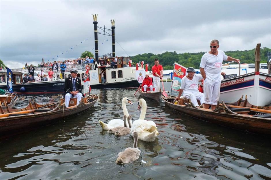 Each July, a flotilla of rowers known as Swan Uppers travels upriver in traditional skiffs. Dressed in scarlet uniforms, they catch and inspect swan families, weighing and measuring the cygnets to monitor the birds’ health and population.