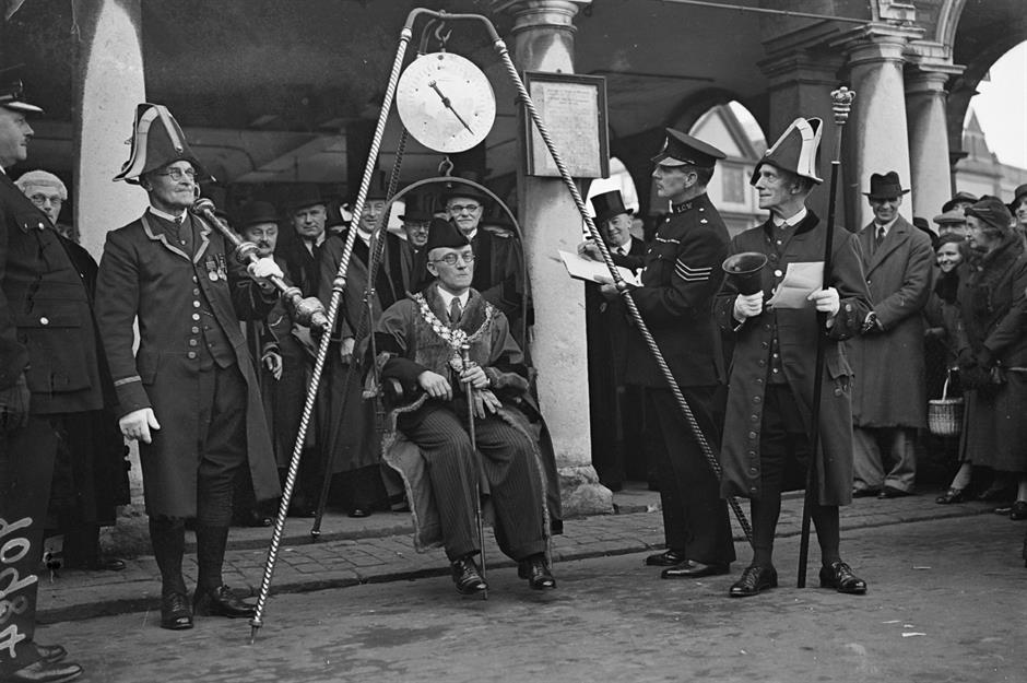 The public ceremony involves the mayor, in full robes, sitting on scales (pictured here in 1937). Traditionally, mayors found to have gained weight during the year were subjected to jeers for ‘growing fat’ (i.e. profiting) at the expense of the townsfolk.