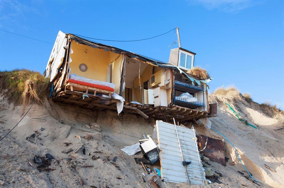 Perchées au bord d’un littoral en constante érosion, ces maisons côtières de la ville britannique de Hemsby, dans le Norfolk, n’avaient aucune chance face à l’une des pires tempêtes que la région ait connues de mémoire d’homme, en 2013.