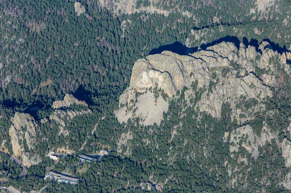 But from above, it becomes clear that the sculptures occupy just a small section of the cliffside, dwarfed by the vast expanse of the surrounding Black Hills.
