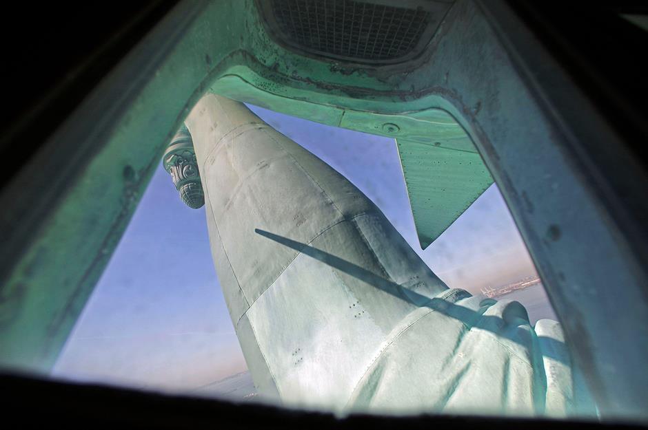 A global symbol of freedom and democracy, the Statue of Liberty was gifted to the United States by France in 1886. Few tourists ever see what she sees, but this photo from inside the crown captures a rare perspective over her raised arm and torch.