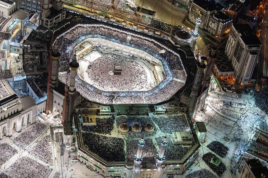 The Kaaba, Islam’s most sacred site, is the focal point of the hajj pilgrimage in Mecca. Every person who makes the hajj must walk around the Kaaba seven times, anti-clockwise, and millions do so each year. From an aerial view, the sheer number of pilgrims in an enclosed space is mesmerising to see.