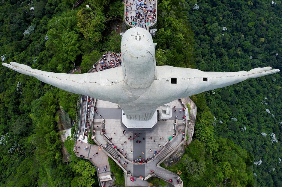 This aerial perspective of Christ the Redeemer offers a striking view not from the front – where the statue’s serene expression and open arms are typically seen – but from directly above its outstretched form.