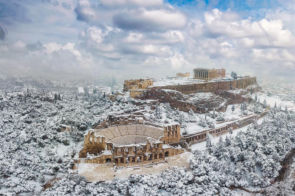 Perched high on the Acropolis, the Parthenon is the most famous ancient Greek monument of them all. Dating back to the mid-5th century BC, it’s rarely seen like this – blanketed in snow during a rare Athens snowfall in January 2022. Seen from a distance, its size and position over the city are even easier to appreciate against the snowy backdrop.