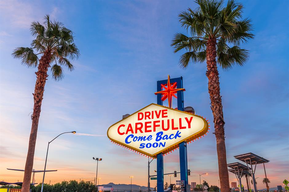 While the front of the 'Welcome to Fabulous Las Vegas' sign is one of the most photographed landmarks in the city, the lesser-seen back has its own quirky charm. It reads, 'Drive Carefully, Come Back Soon' – a friendly farewell to visitors leaving the Strip.