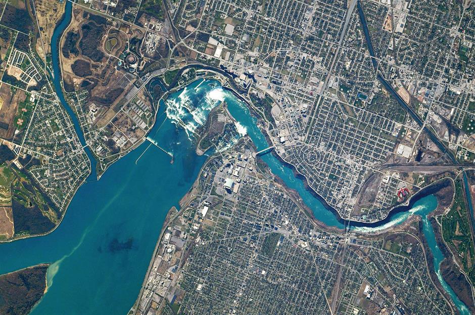 Seen from space, Niagara Falls reveals its full scale and force as water cascades through the gorge between New York and Ontario. Goat Island and Luna Island split the Niagara River into three distinct waterfalls – Horseshoe, American and Bridal Veil. From this height, the sweeping power of nature and the contrast between land and water are unmistakably clear.