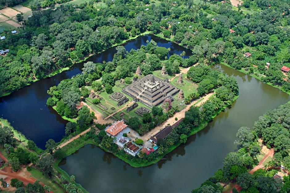 This ancient moated megacity is surrounded by verdant forests that, when viewed from above, stretch as far as the eye can see. From an aerial view, this incredibly vast temple appears to be swallowed up by nature.