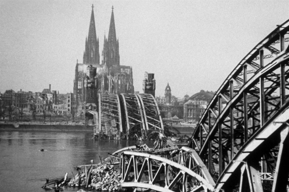 Hier ist der Kölner Dom 1946 hinter der zerstörten Hohenzollernbrücke zu sehen, die nach dem Krieg wiederaufgebaut wurde.