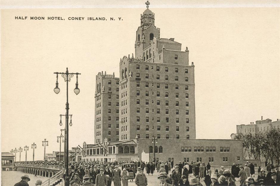 The 220-foot-tall Half Moon Hotel opened on the Riegelmann Boardwalk at West 29th Street in May 1927. It was initially hoped that the new property would help Coney Island compete with Atlantic City in New Jersey.
