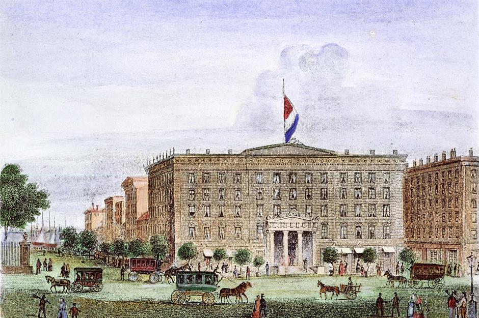 For decades, Astor House was the most prestigious hotel in America. Located on the corner of Broadway and Vesey Street, and designed by Isaiah Rogers, it had 309 rooms over five stories. Astor House would not allow unaccompanied women to enter, in an effort to prevent call girls from plying their trade there.