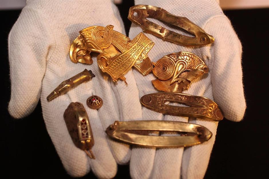 Le Staffordshire Hoard, un trésor enfoui composé de 4 000 pièces de métal élaboré, constitue la plus grande collection d’artefacts d’or et d’argent anglo-saxons jamais mise au jour. Découvert grâce à un détecteur de métaux en 2009 près de la ville de Lichfield, il aurait été enterré au VIIe siècle après J.-C., à l’époque où la région appartenait au royaume de Mercie.