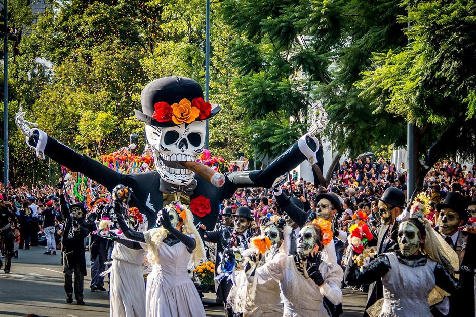 Chaque année, des milliers de personnes participent au défilé du Jour des morts à Mexico, le visage couvert de maquillages en tête de mort colorée et vêtues comme La Calavera Catrina, incarnation emblématique de la Mort.