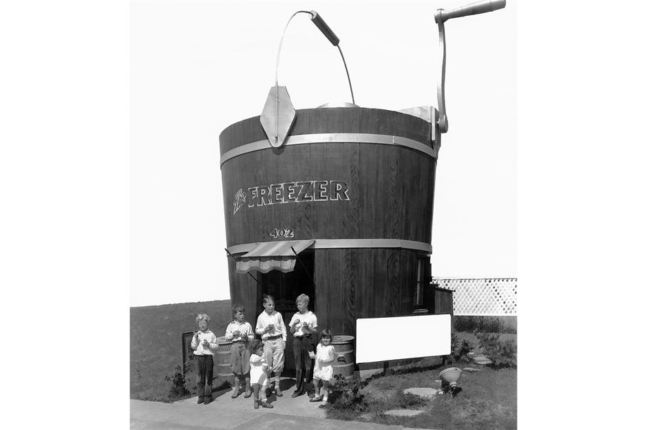 Buying an ice cream from a store in the shape of an old-fashioned churn must have been a real treat for kids back in the 1920s. The Freezer was a mini chain of parlors that dotted LA, each built in the shape of a churn with a hand crank sticking out of the top.