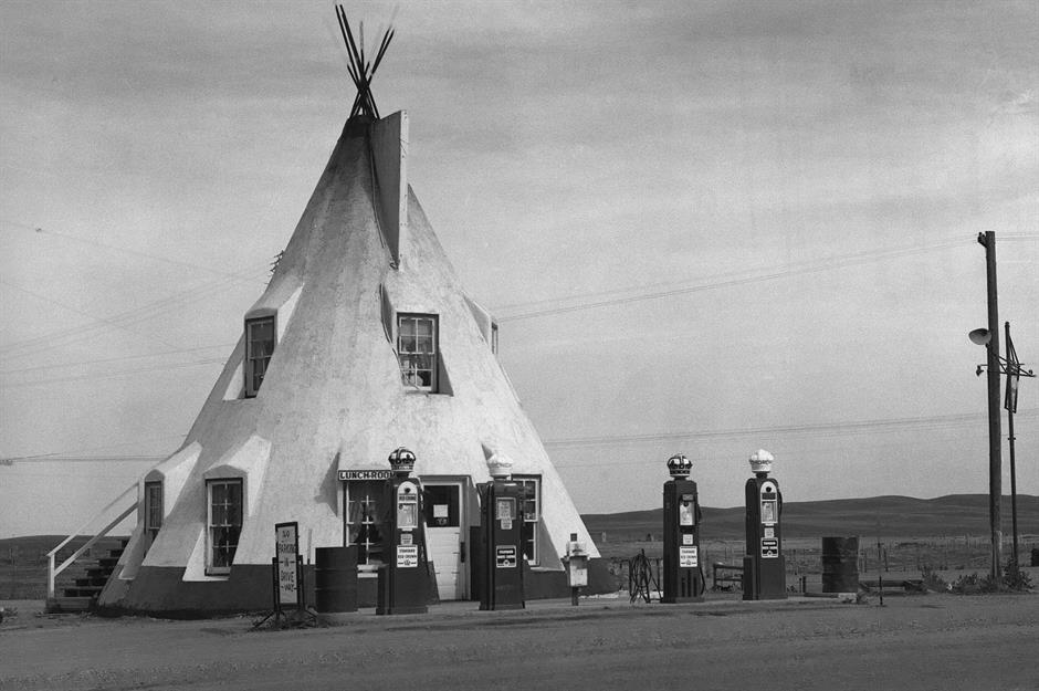 Kramer’s Wigwam, built between 1930 and 1933 in Browning, Montana, was a gas station shaped like a giant concrete tipi.