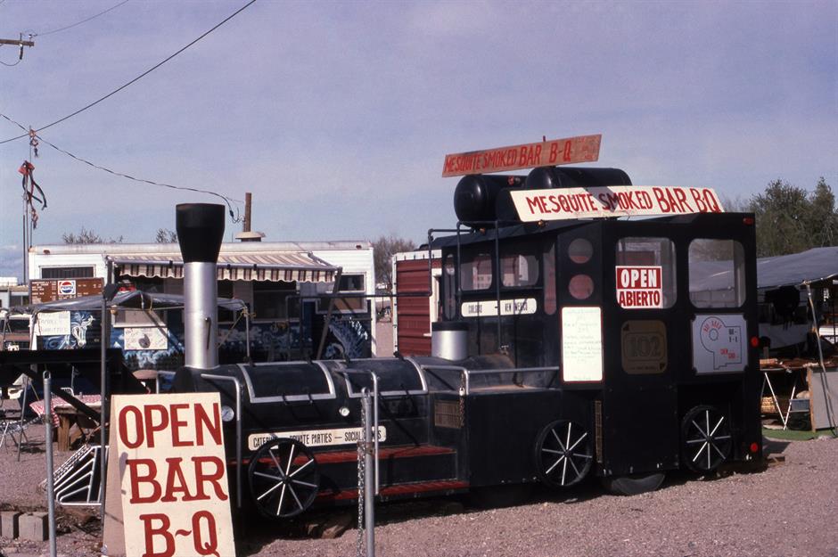 This photo from 1992 shows a novelty food stand shaped like a train engine, which served mesquite-smoked barbecue.