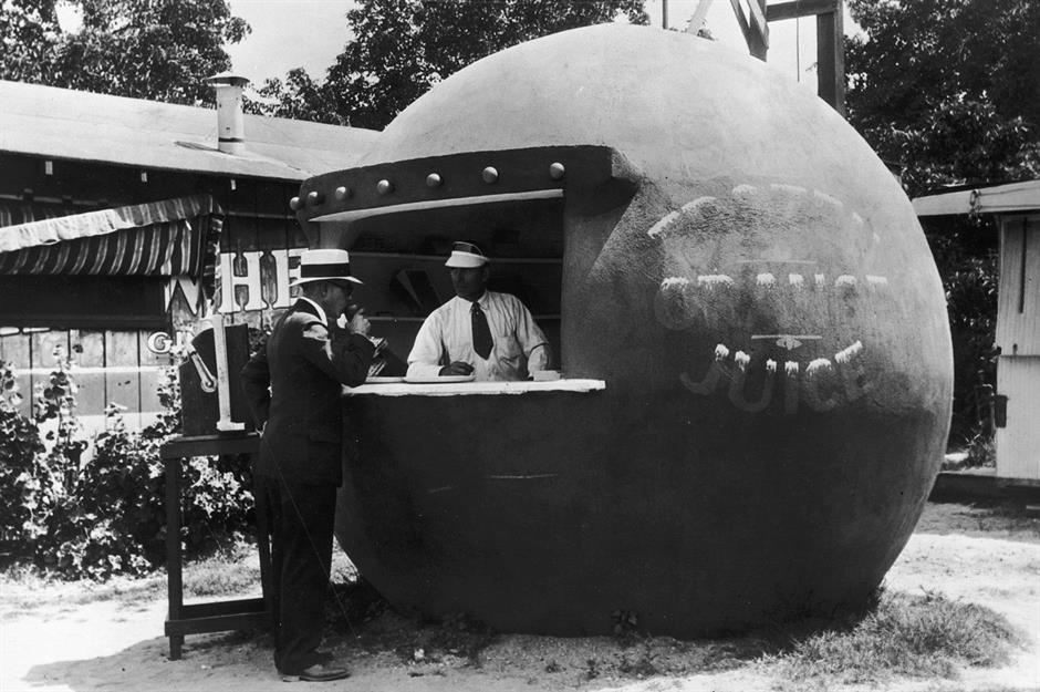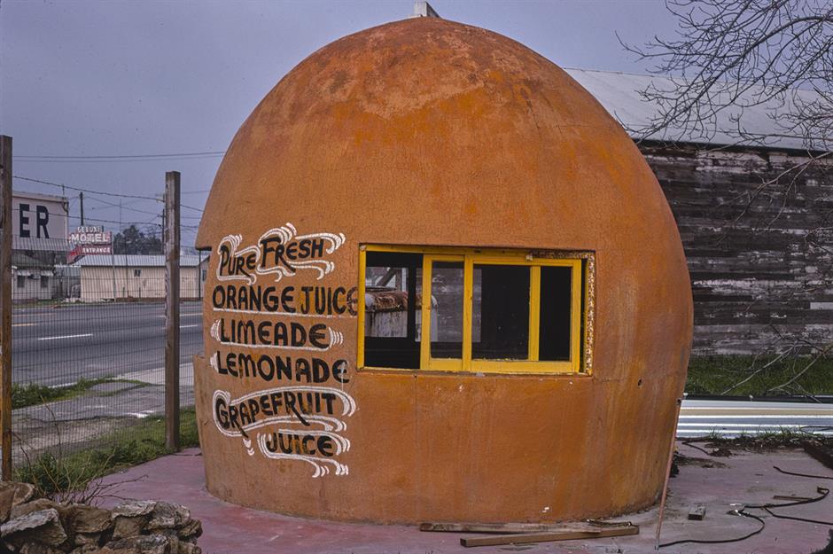 Likely made from wood and plaster, this giant orange stood in El Monte, California, and would have been kitted out with a hand juicer and perhaps also a hot dog steamer.