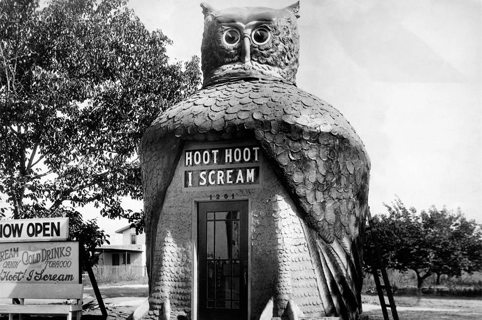Hoot Hoot I Scream was an ice cream parlor built in 1926-27 by Roy Hattrup, whose wife Tilly ran the stand. Designed in the shape of a giant owl, the building had a rotating head and glowing eyes made from Buick headlamps.