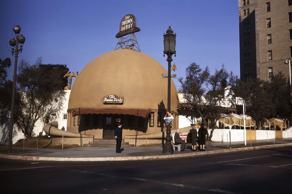 The original restaurant (pictured) was built on Wiltshire Boulevard in 1926 and became a hotspot for celebrities, hosting stars like Cary Grant, Ava Gardner, Charlie Chaplin, and Ronald Regan. Clark Gable and Carole Lombard even got engaged there in 1939. According to Hollywood legend, the Cobb salad was invented at the Brown Derby in 1937.