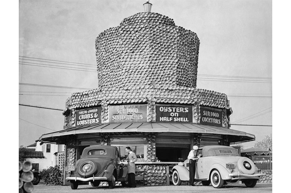 This drive-in was originally a coffee shop in the shape of – you guessed it – a giant coffee pot, before it was transformed into a seafood restaurant and covered in 50,000 abalone shells. The shells reportedly took several months to collect, but just 30 days to stick onto the striking building.