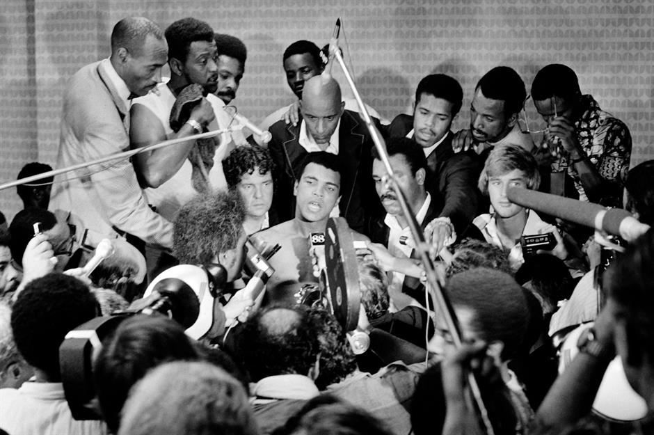 Brainchild of President Mobutu Sese Seko and boxing promoter Don King, the brutal bout saw Foreman suffer a come-from-behind knockout and lose his heavyweight crown. This photo shows Ali during his post-victory press conference.
