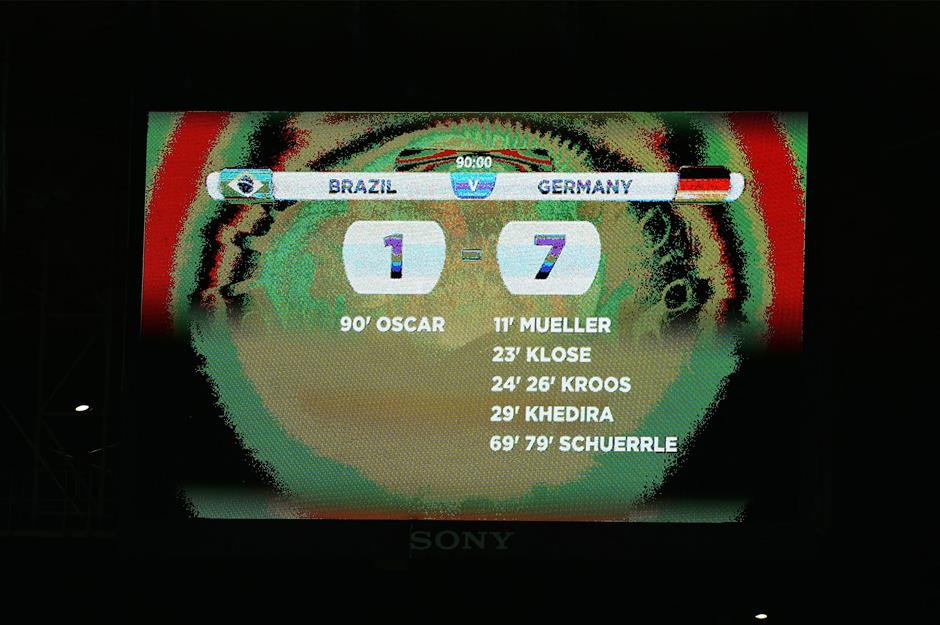 They hadn't, however, counted on a ruthless Germany team, led by Joachim Löw, spoiling the party in brutal fashion. The host's 7-1 semi-final defeat (shown here on the stadium's scoreboard), in which they were 5-0 down at half-time, didn't just rip up the script; it set fire to it. Although Brazil were without key men Neymar and Thiago Silva, the nature of this result was still a shock.