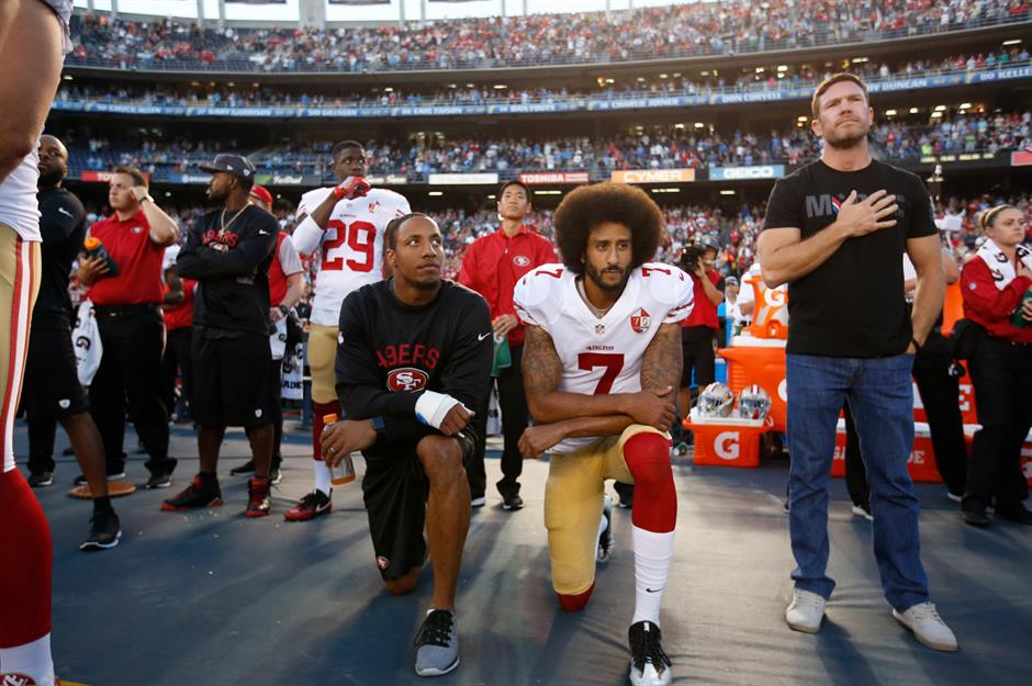 When Colin Kaepernick knelt during the American national anthem, prior to a pre-season game between the San Francisco 49ers and the San Diego Chargers, he did so to protest racial injustice and police brutality. "I am not going to stand up to show pride in a flag for a country that oppresses Black people and people of colour. To me, this is bigger than football," he said.