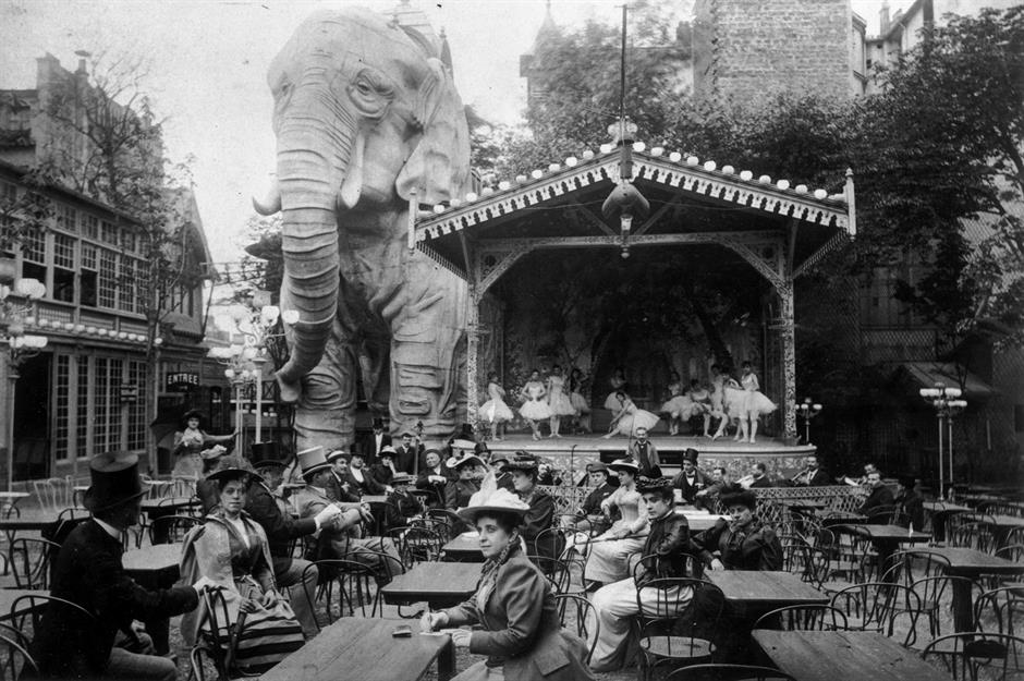 The Jardin de Paris at the infamous Moulin Rouge nightclub featured a striking giant stucco elephant, purchased from the 1889 Paris World's Fair. Guests could ascend a spiral staircase inside the elephant’s leg to reach a unique performance space, where belly dancers entertained patrons in the torso of the animal.