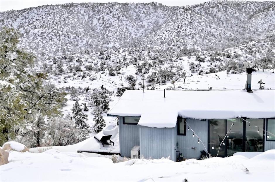 Connue sous le nom de Glass Cabin, cette maison isolée et autonome est disponible à la location sur Airbnb. Elle permet de vivre une véritable immersion dans le désert californien. Si l’on pourrait s’attendre à une chaleur écrasante toute l’année, Pioneertown connaît en réalité des hivers frais et peut même voir tomber la neige.