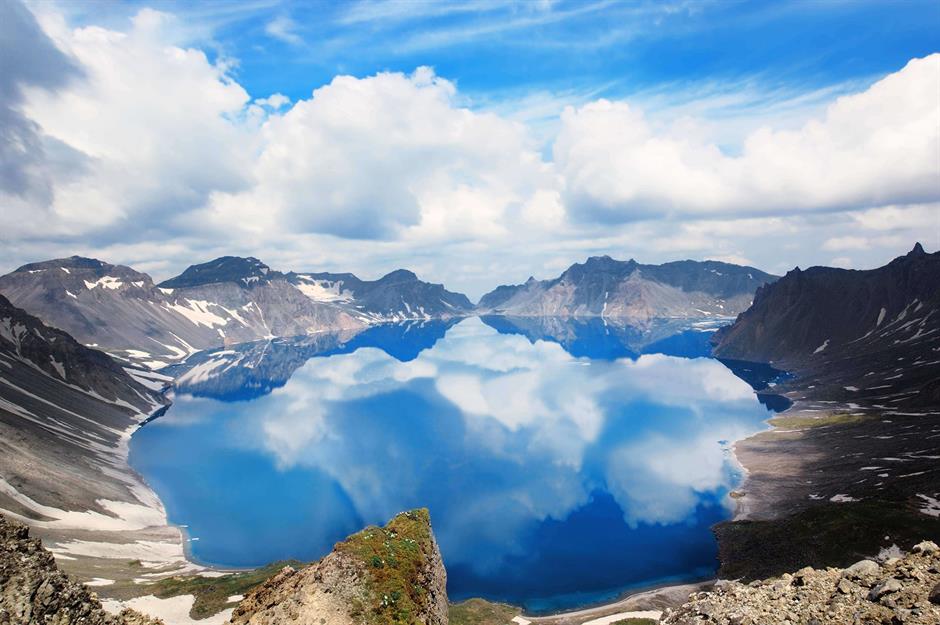 Formed by a massive eruption in AD 946, Heaven Lake – or Tianchi in Mandarin – fills a volcanic crater atop a mountain known as Changbai in China and Paektu in Korea. It straddles the China-North Korea border and is sacred in Korean mythology as a sentient being and the birthplace of Korea's legendary founder. In North Korea it's also claimed that former supreme leader Kim Jong-il was born nearby.