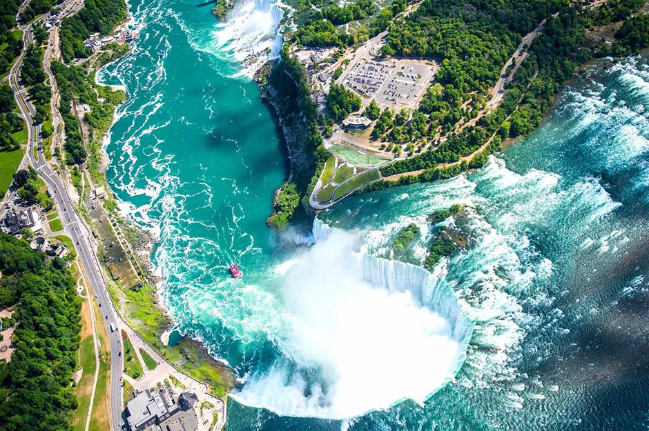 Niagara Falls straddles the border between Ontario, Canada and New York, USA, and is made up of three waterfalls: Horseshoe, American and Bridal Veil. Formed 12,000 years ago by glacial melt, it channels water from four Great Lakes into the Niagara River.