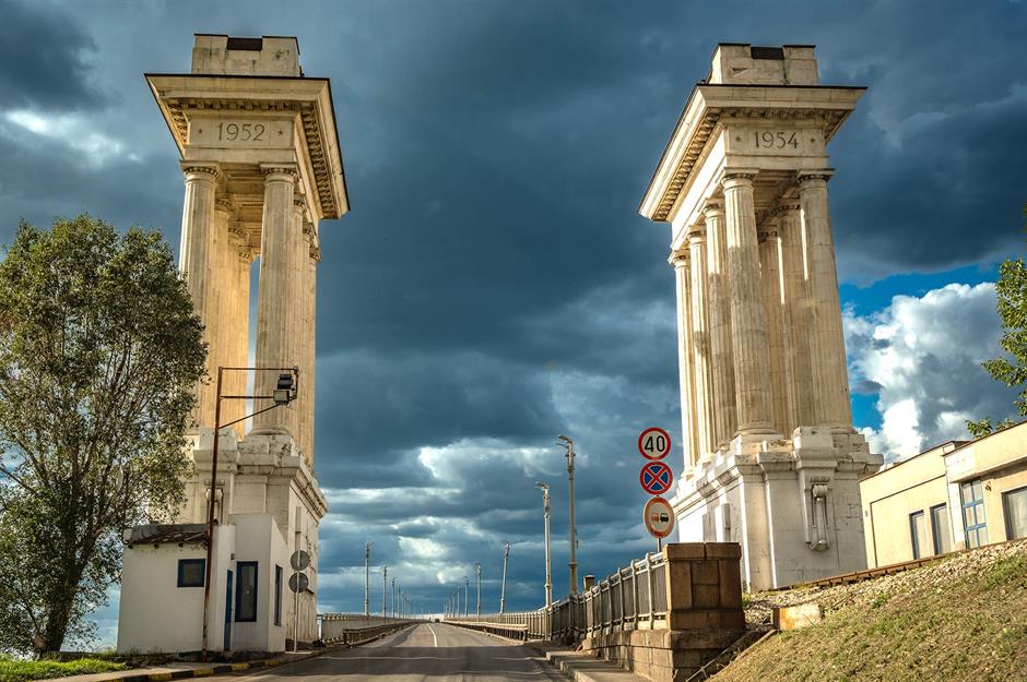 The Bridge of Friendship, also known as the Danube Bridge, connects Ruse, Bulgaria and Giurgiu, Romania. It opened in 1954 and was the first bridge over the Danube between the two countries. A pair of columned buildings stands at each end; originally border control posts, they were inspired by Soviet monumental architecture, reflecting the Soviet Union’s involvement in the bridge's construction.