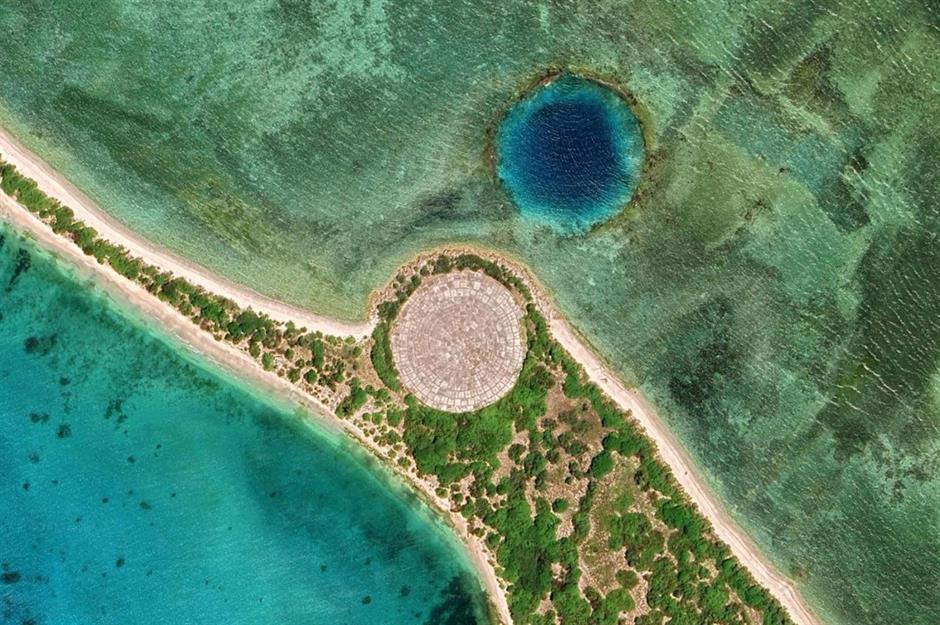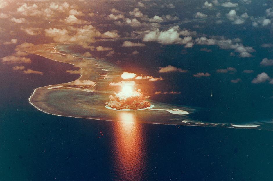 Pictured here is Enewetak Atoll, a chain of 40 coral islands that bore the brunt of a series of Cold War experiments. The fireball rising over the landmass was caused by the Seminole nuclear blast, part of a series of thermonuclear bomb tests in 1956 known as Operation Redwing. Information regarding the experiments has only been declassified in recent decades.