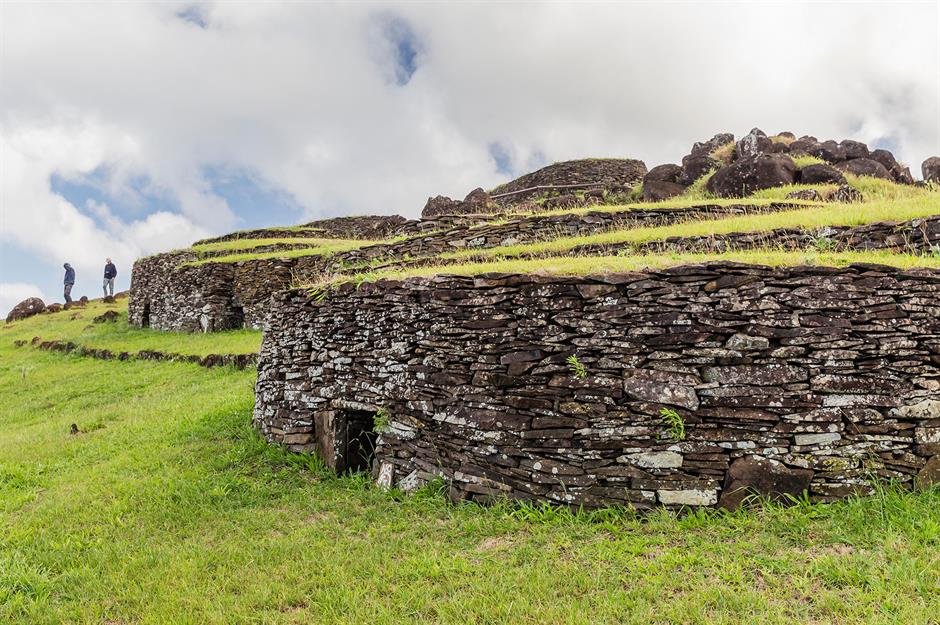 Pictured here are restored stone houses at Orongo, a ceremonial village on the island used by the Rapu Nui people during the era of the Birdman religious cult, which had replaced the worship of the moai by 1600.