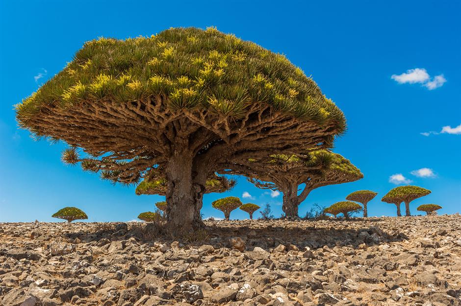 More than a third of its plant life is unique to the island, resulting in mysterious, otherworldly landscapes unlike anything elsewhere. One species that only grows on the isle is the dragon's blood tree, with its mushroom-shaped canopy and blood-red sap.