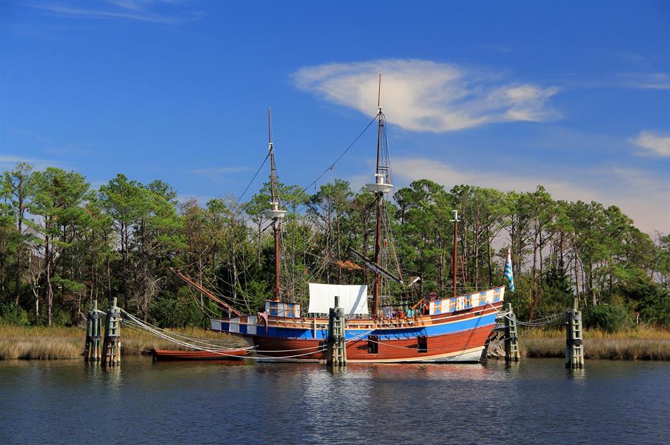 Located off the coast of North Carolina, Roanoke Island is the site of one of the most perplexing mysteries in American history. After failing to establish the first English colony on the isle in 1585, British explorer Sir Walter Raleigh dispatched a second voyage of colonists in 1587 in ships resembling the vessel pictured here. While their destination was Chesapeake Bay, they were brought ashore on Roanoke Island instead.