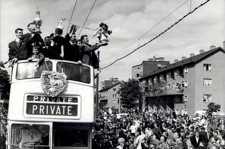 After securing the league in April, they ran out 2-0 winners against Leicester City at Wembley in early May to claim the cup as well. They were the first English club to achieve the ‘double’ feat in the 20th century. Pictured, the team and their fans celebrate an unprecedented season of success with an open-top bus parade.