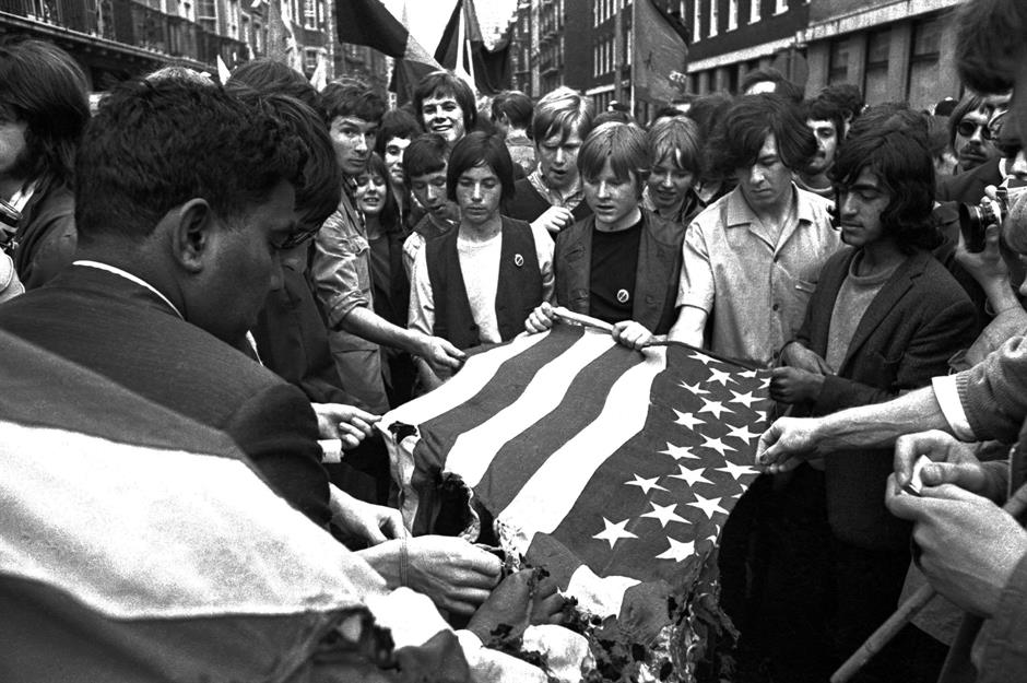 On 17 March 1968, an estimated 10,000 demonstrators hit the streets of London to protest against the Vietnam War and the British government’s ongoing support for the Americans. Making their feelings known outside the United States Embassy in Grosvenor Square, rally attendees set fire to the ‘stars and stripes’ (pictured) as a symbolic act of displeasure.