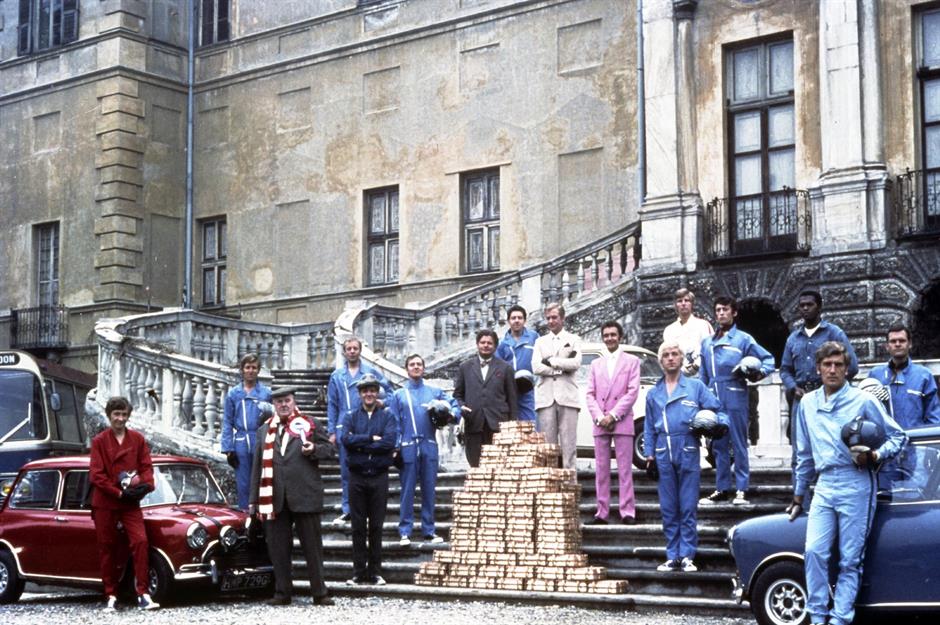 Exhilarating scenes where red, white and blue Mini Coopers tear down historic streets and through colonnaded piazzas, as well as the ultimate cliffhanger ending, mean it endures as a cultural cornerstone. Here we see a promotional photo of Caine and the rest of the cast, posing with their getaway vehicles and the gold.