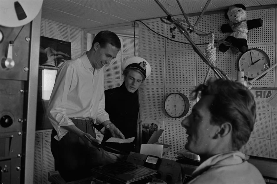 Taken in June 1964, this photo shows us singer Adam Faith (centre) getting into the swing of things with a nautical hat. Either side of him, in the vessel’s studio, we can see DJ Simon Dee and Captain McKay.