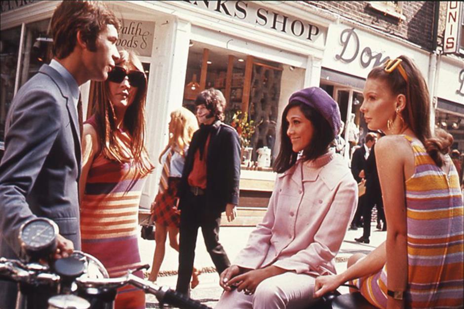 By the middle of the decade, 40% of the population was under 25. This, combined with the abolition of National Service for men, meant an entire generation had been granted the freedom to shake things up creatively. Pictured here on Carnaby Street, the trendiest and most stylish thoroughfare in London, young people converse on a sunny day.